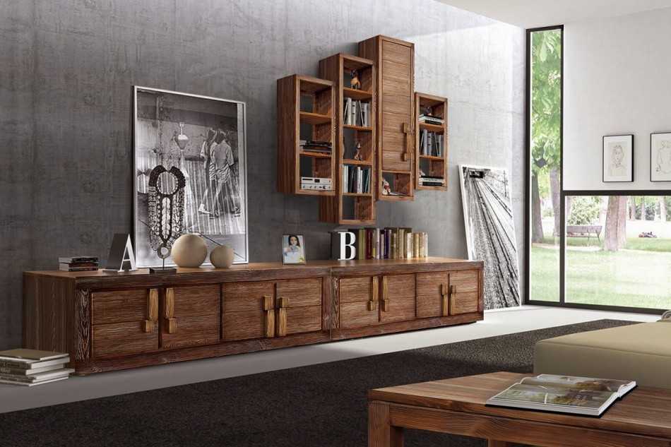 В гостиной встречаются открытые стеллажи из дерева и металла, громоздкие тумбы, комоды, кресла и навесные полки.