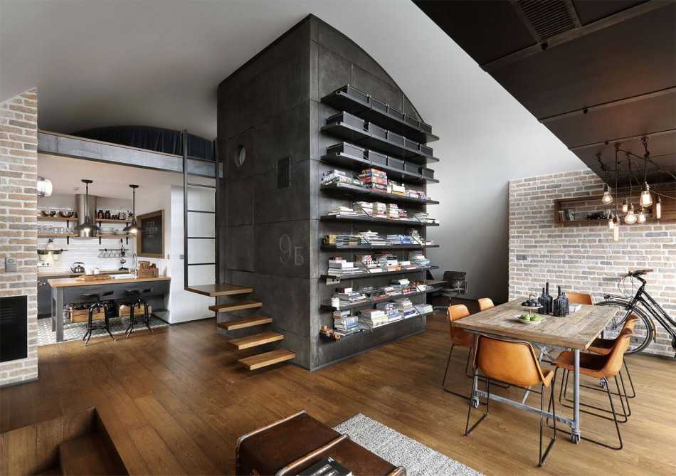 Стиль предполагает имитацию незавершенности ремонта, естественные материалы, наличие характерных для заводского помещения элементов.