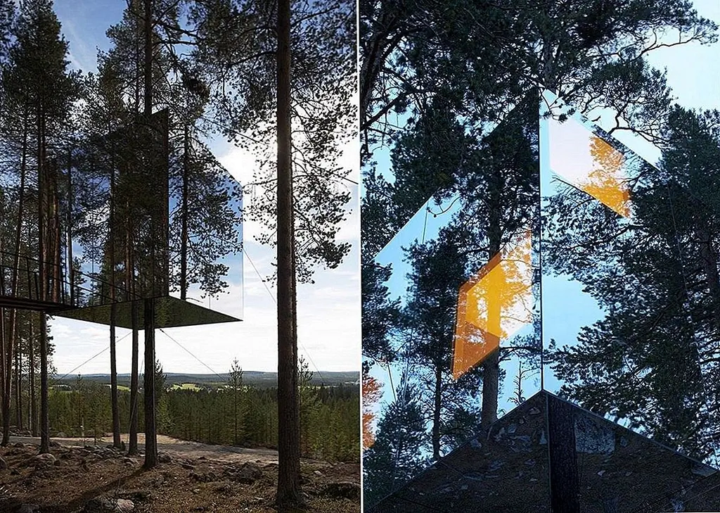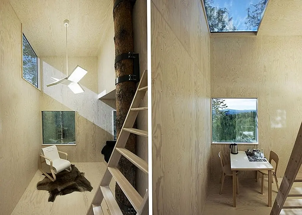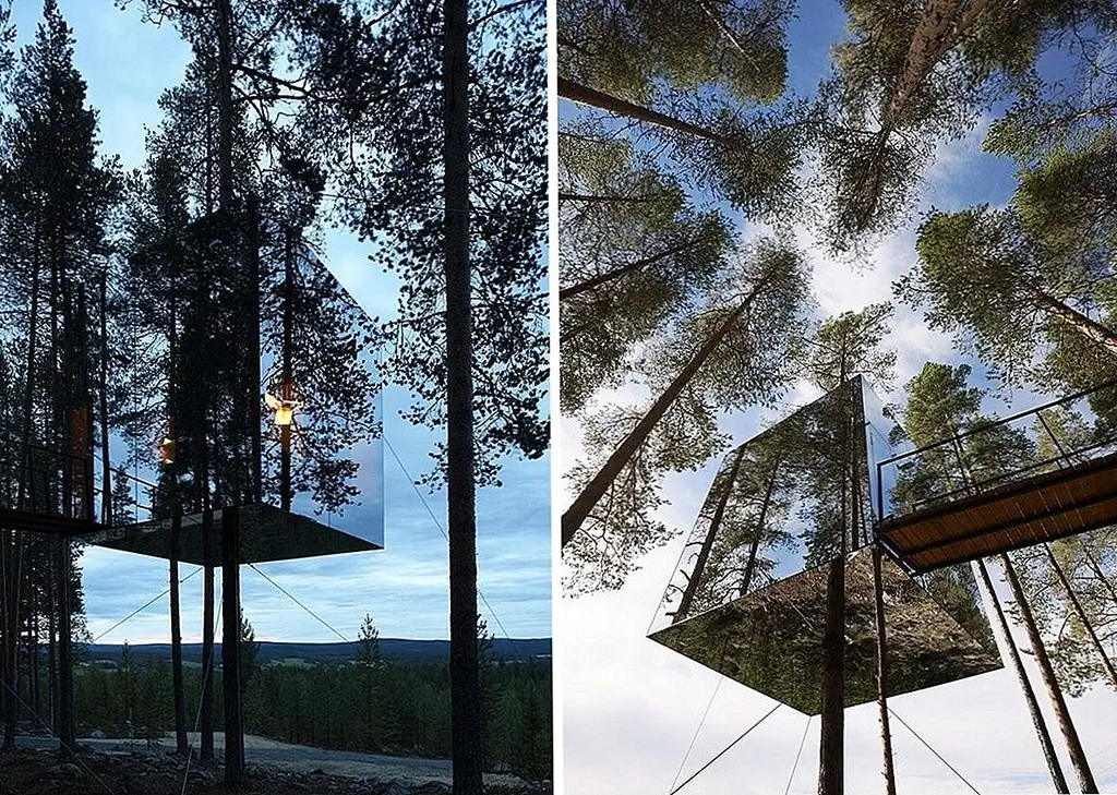 Тройные деревья – это не то, кем они были раньше, по крайней мере, не современные и сложные, такие как Tree Hotel from Harads, Швеция. Структура представляет собой кубический объем, обернутый вокруг ствола высокого дерева. Он легкий и изготовлен из алюминия, а его внешний вид одет в зеркальное стекло, что позволяет ему идеально сочетаться с окружающей средой и отражать небо и деревья. Интерьер выполнен из фанеры и предлагает 360 градусов ландшафта. Внутренние функции включают в себя гостиную с террасой на крыше, спальню и небольшую ванную комнату. Чтобы добраться до входа, нужно пересечь веревочный мост, подключенный к следующему дереву. Это был проект Tham & Videgård Arkitekter.
