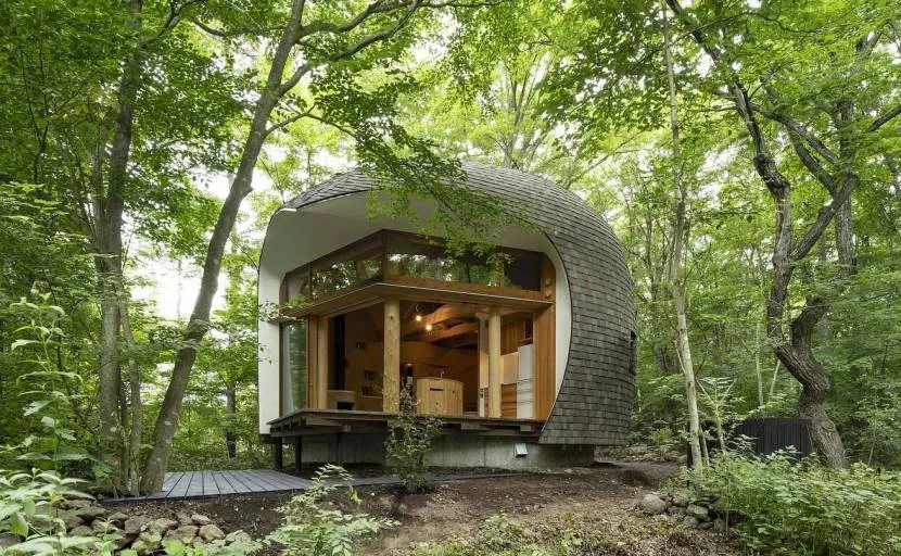 Мини-дом от японского архитектора Тоно Мирая выделяется органической формой и продуманностью деталей. Природная цветовая гамма в сочетании с округлым фасадом из гибкой черепицы делают постройку похожей на гриб, выросший из-под земли. В отличие от многих других проектов этот дом не пристанище для туристов, а полноценное жилое строение (в нем живет супружеская пара).
