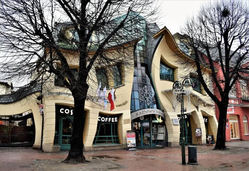 Несмотря на причудливый внешний вид, кривой дом невероятно функционален и по праву считается одной из главных достопримечательностей города. Возле этого поистине необыкновенного строения постоянно кипит жизнь и движение. На первом этаже причудливого дома располагаются уютное кафе и магазинчики. А на втором находятся студии популярных радиостанций. Будете в Польше — обязательно сфотографируйтесь на фоне этого футуристического строения.