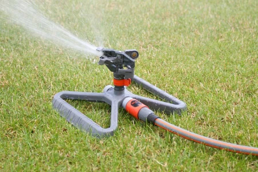 Дождевателями. Вода распыляется по почве, имитируя дождь, часто такое распыление используется для газонов. Часто подобное распыления является чрезмерно обильным для некоторых видов растений.