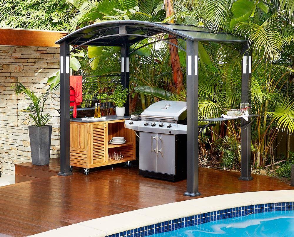 Располагаются барбекю мангалы чаще всего под небольшим козырьком или навесом. Также установка возможна в беседке в саду или на веранде. Допускается использование в качестве летней кухни. Навес в данном случае позволяет защитить агрегат от осадков и воздействия других природных факторов.