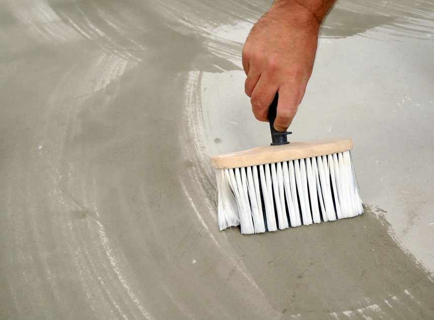 Нанесение состава повышает адгезию к отделочным материалам. Без предварительной подготовки бетон будет иметь низкую впитывающую способность, а потому окрасить основание и оштукатурить будет невозможно. После нанесения раствора глубокого проникновения проще оклеивать стены тяжёлыми обоями.