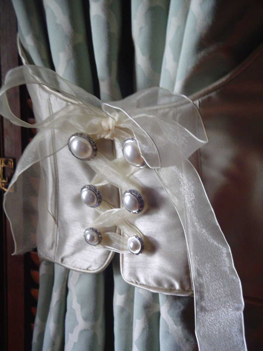 Другим материалом для украшения штор станут старые бусины, остатки стекляруса, бисера и прочих материалов для подделок. Их равномерно нанизывают на ленту, чередуя с узлами из ткани. Края ленты завязывают в бант или обшивают мелкими бусинами. Подобные украшения используют как подвески или завязки, а также обшивают ими края портьер и ламбрекенов.