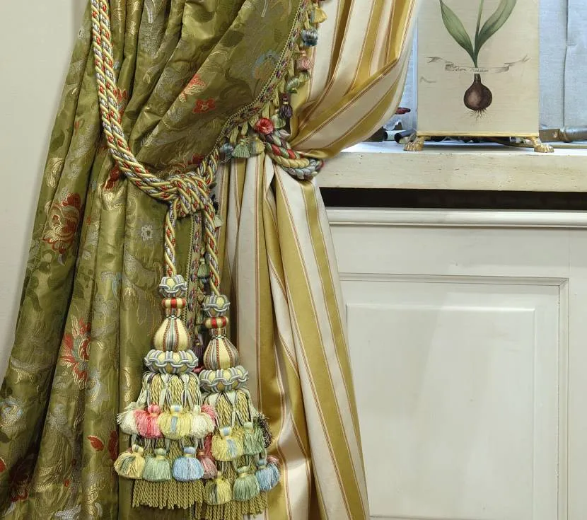 Это одни из самых популярных видов украшений для занавесей. Причем яркая бахрома и пышные кисти могут размещаться не только на оконных шторах, но и на спальных балдахинах, тканевых перегородках, покрывалах. Разнообразие цветов, форм и размеров таких аксессуаров позволяет использовать их в классических, этнических и даже современных интерьерах со смешанным стилем.