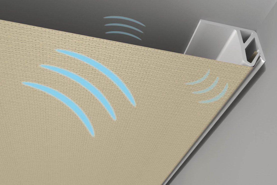 Акустический потолок clipso состоит из полотна с микроперфорацией, закрепленного по периметру помещения с помощью багета со сложным сечением. Под натяжное полотно к базовой поверхности монтируются звукопоглощающие плиты Шуманет БМ. Такая конструкция почти полностью изолирует помещение от посторонних звуков и устраняет звуковое эхо.