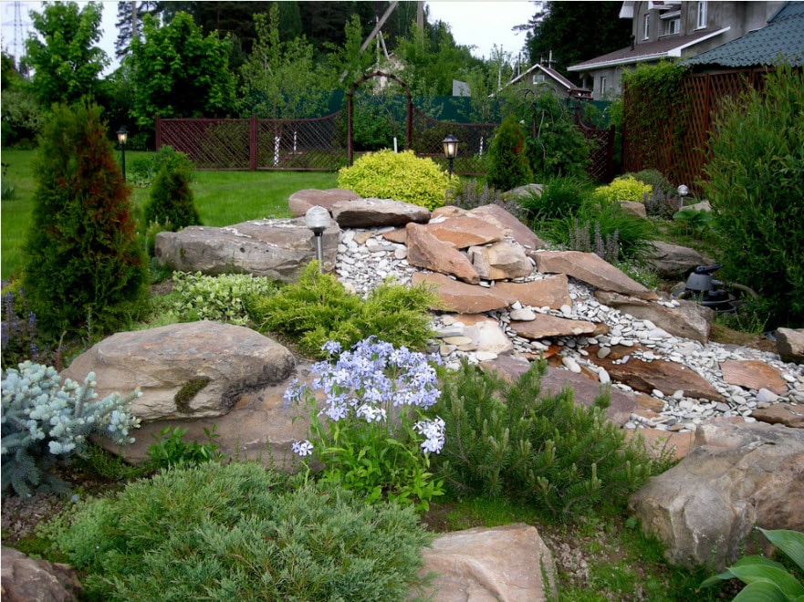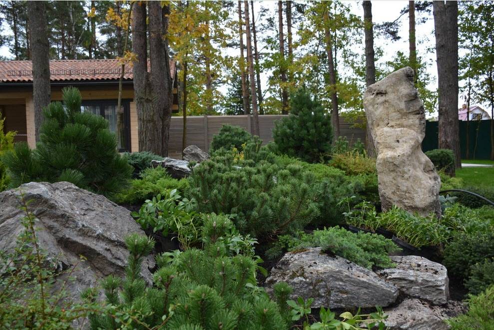Это может быть сосна, вертикальный можжевельник, туя. Главное, чтобы они не были слишком высокими и разветвленными, чтобы не загораживать собой камни. Для высаживания между камнями подходят самые различные цветы, кустарники, карликовые деревца. Главное, всегда учитывать сезонные особенности, хорошую адаптацию под текущий климат, следить за грунтовкой, чтобы не дать разрастись сорнякам. Нужно также подбирать соседствующие растения внимательно, иначе дизайн горки может выглядеть неорганично, а растения возможно будут мешать росту друг друга