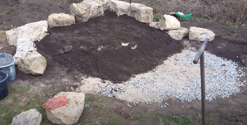 По завершению земляных работ лучше дать сооружению немного постоять. Грунт осядет, станет более плотным. Если сразу перейти к укладке камней, могут быть проблемы с их смещением.