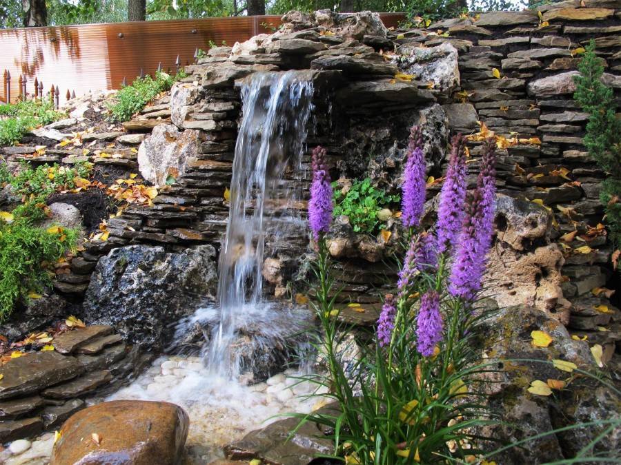 Есть альпийские овраги. Если на участке имеется похожий рельеф, можно обустроить его, сделав искусственный ручей. Для этого дно и края выложить камнями, сделать внизу небольшой пруд, из которого воду насосом подавать на вершину вашего «утеса».