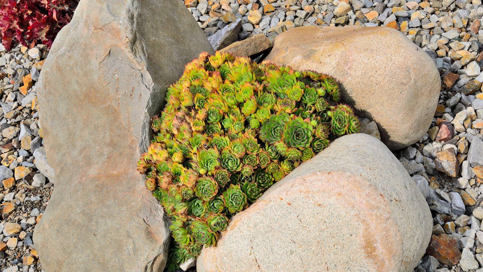 Розеточные растения не сажают вместе с почвопокровными. Луковичные культуры можно прорастить в торфяном горшочке, а затем перенести в альпинарий