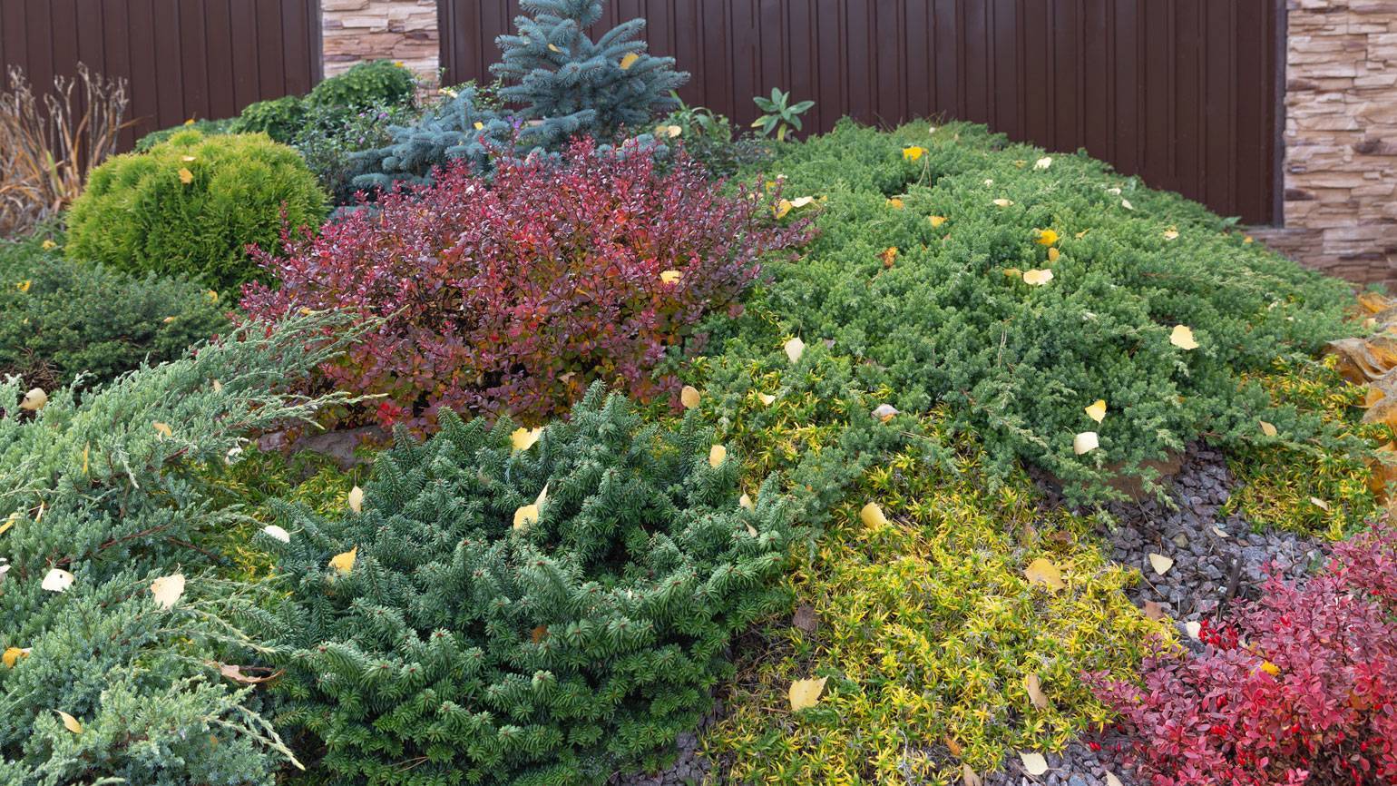 - кустарники и карликовые хвойные (барбарис, кизильник, сосна, туя, можжевельник);