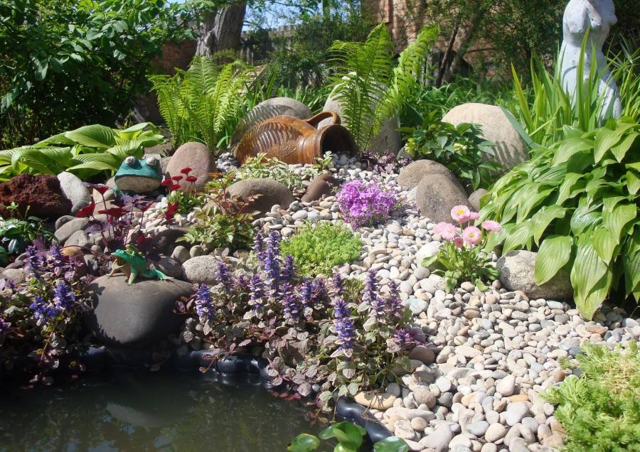 По берегу ручья и пруда высадить влаголюбивые растения, на камнях — подходящие их альпийских трав, цветов и многолетников. Такое сооружение, безусловно, сложнее в техническом плане, больше требует оно и затрат — пруд, ручей, горка — все требует вложений. Такие сложные системы считаются уже ландшафтными горками, так как частично меняют внешний вид всего участка.