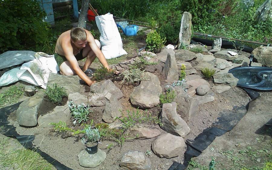 - Далее происходит укладка камней в зависимости от стиля композиции. Сначала выкладываются крупные валуны, после чего камни мельчают. Между камнями нужно оставлять промежутки, чтобы высаживать растения.