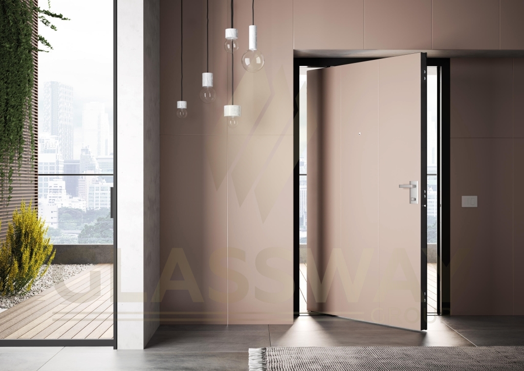 - Распашные двери – это стандартный вариант стеклянных одно- или двустворчатых полотен. Эти модели идеально подчёркивают любую стилистику дома. Из-за петлевого соединения блок можно открыть только в одном направлении, чтобы улучшить свои звукоизоляционные свойства. Распашные стеклянные изделия на алюминиевом каркасе позволяют визуально увеличить пространство за счёт обилия света, проникающего внутрь помещения. Но такой механизм открытия требует большой площади, поэтому установить конструкцию получится только в крупногабаритных помещениях.
