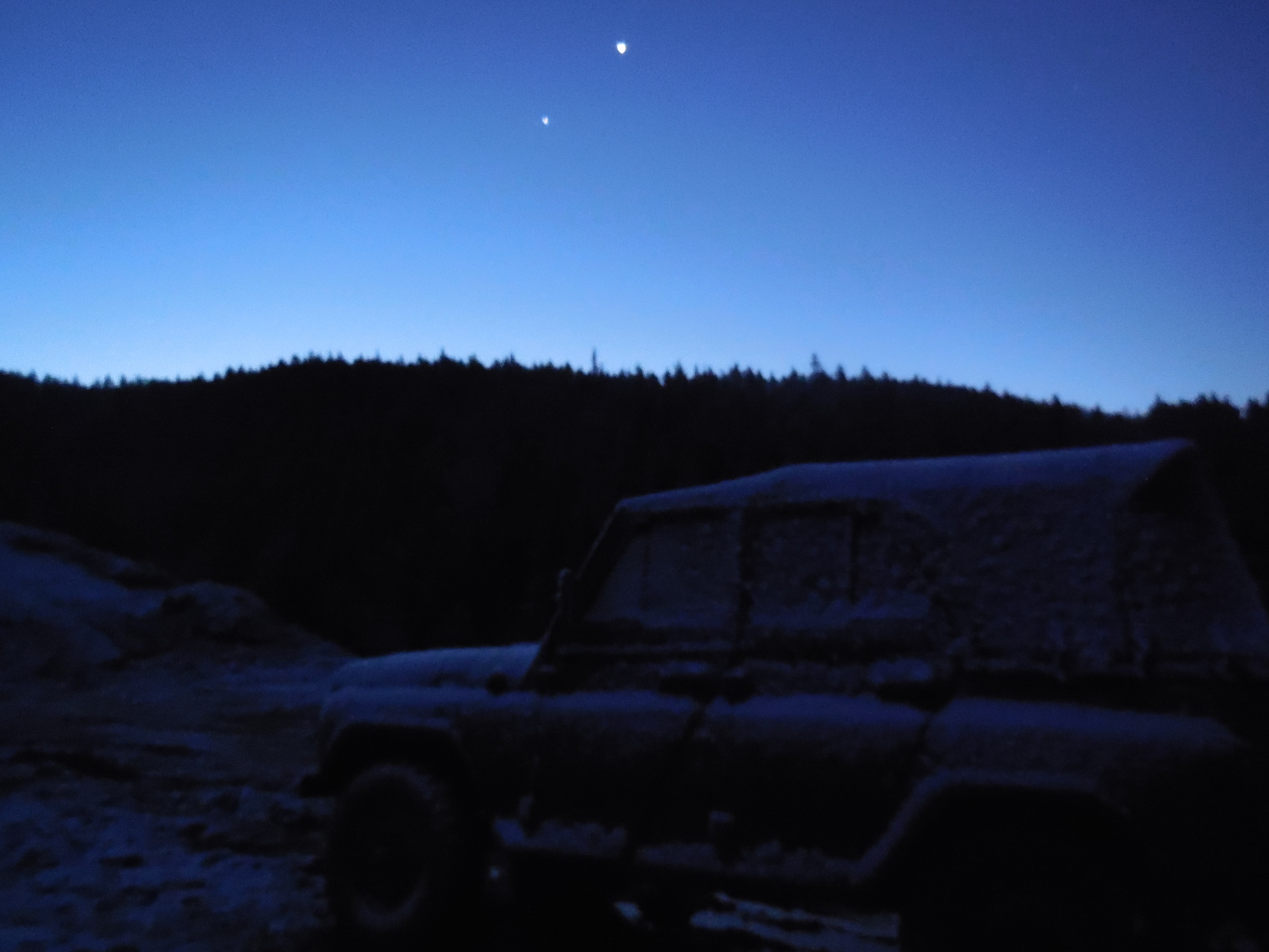 Недалеко от реки Стародинской уже в темноте, в совершенно безлюдном месте, когда позади остались поселки Краснополье и Медвежье, на перевале, мы заприметили сторожку, в окне которой мелькал огонек. Решено было попытать счастья: не хотелось ночевать в палатке в такой холод. Навстречу вышел человек с фонарем, и вскоре нам уже было объяснено как добраться до другой сторожевой будки, что в ста метрах отсюда. Та будка пустует, поскольку у сторожа сегодня выходной, там есть печка, без проблем можно заночевать (как выяснилось это будки сторожей, стерегущих дорожно-строительную технику).