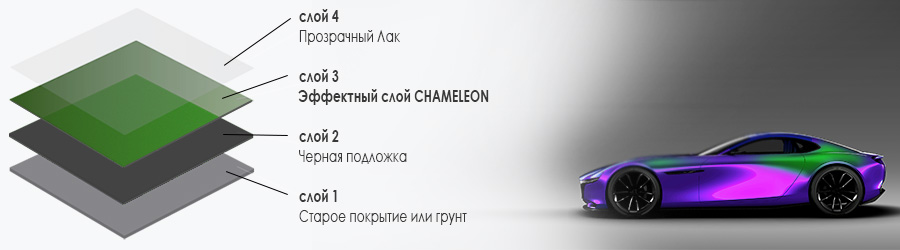 Качественной покраски автомобиля «хамелеоном» можно добиться за счет точного следования инструкции – в продаже имеются готовые наборы. Стоимость комплекта заметно выше собственной работы или даже обращения за помощью к колористу, однако для получения результата достаточно просто следовать указаниям производителя. Для создания эффекта «хамелеона» потребуется три слоя разных материалов: