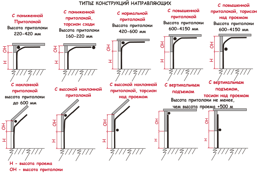 Способ монтажа секционных ворот выбирают в зависимости от габаритов проема, высоты притолоки и глубины помещения. Основные варианты установки представлены на схеме ниже.