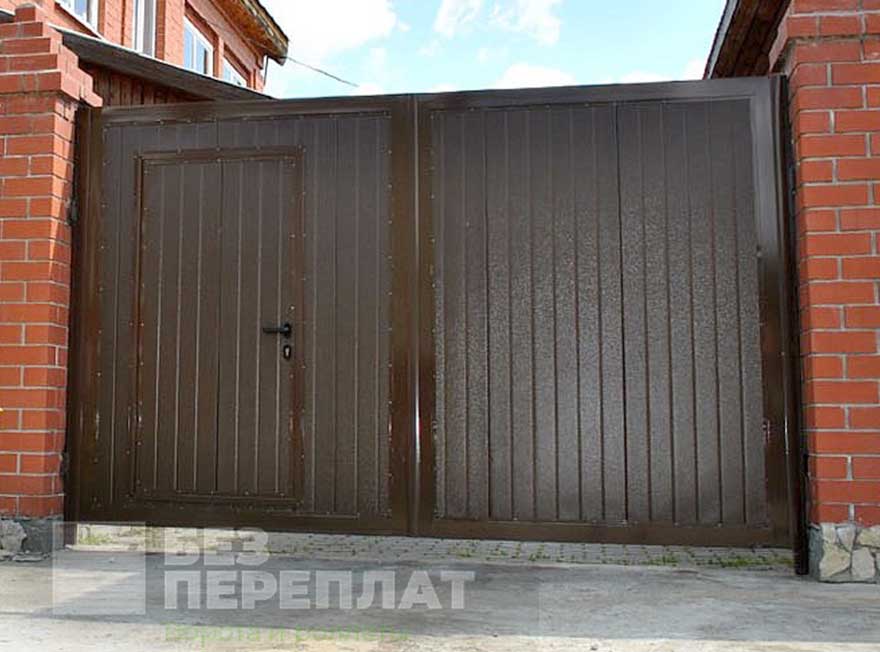 Характерные особенности любых распашных конструкций – прочность, отличная функциональность, удобство при перемещении через них. Традиционный материал всех типов самодельных распашных конструкций – металлические профили или трубы, а также обшивка в виде железа. В двустворчатых широких воротах сооружают небольшую дверь для прохода людей.