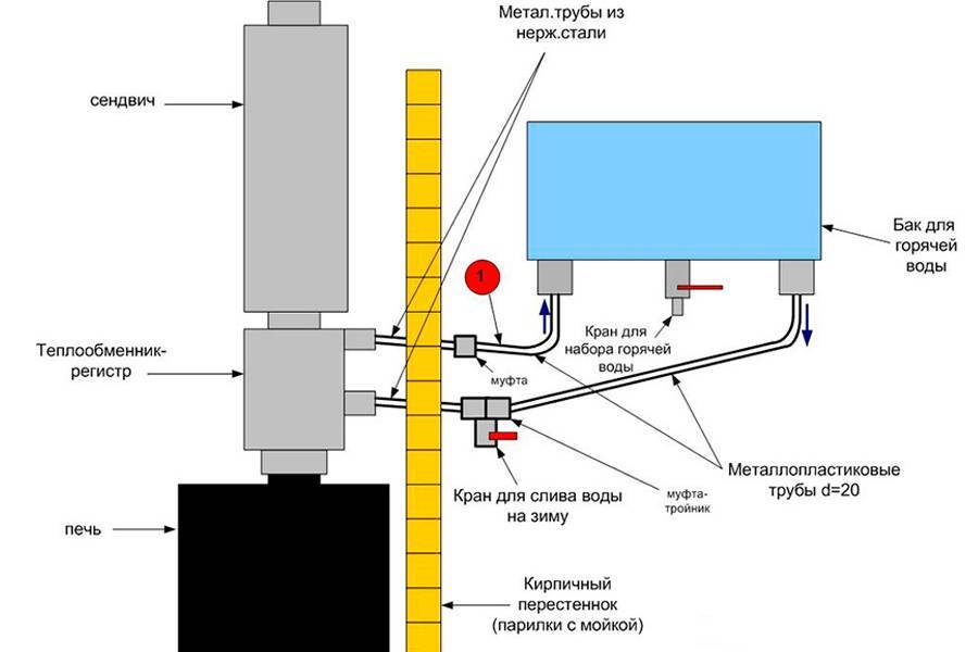 Если к бане подходит водопровод, то более подходит выносная система. Она показана на рис. 1. В этом случае на дымоходе монтируется змеевик. Выход горячей воды в направлении выносного бака осуществляется сверху, а возврат теплоносителя, соответственно, снизу. При монтаже необходимо установить нужную запорную аппаратуру (клапаны, краны, вентили).