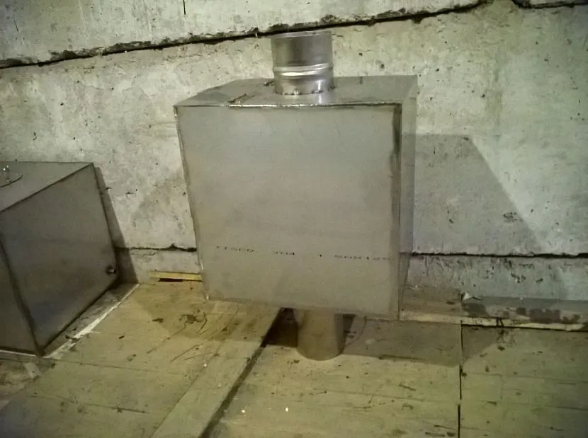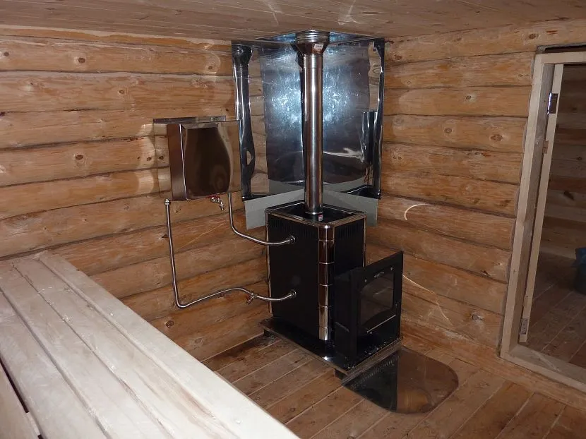 - Второй способ подразумевает установку бака для бани из нержавейки на трубу. Нагрев воды в таком случае осуществляется от каменки, расположенной ниже. Чтобы упростить себе задачу, можно приобрести специальный нержавеющий бак, в который уже встроен отрезок дымохода. Такую конструкцию нужно будет только закрепить на месте.