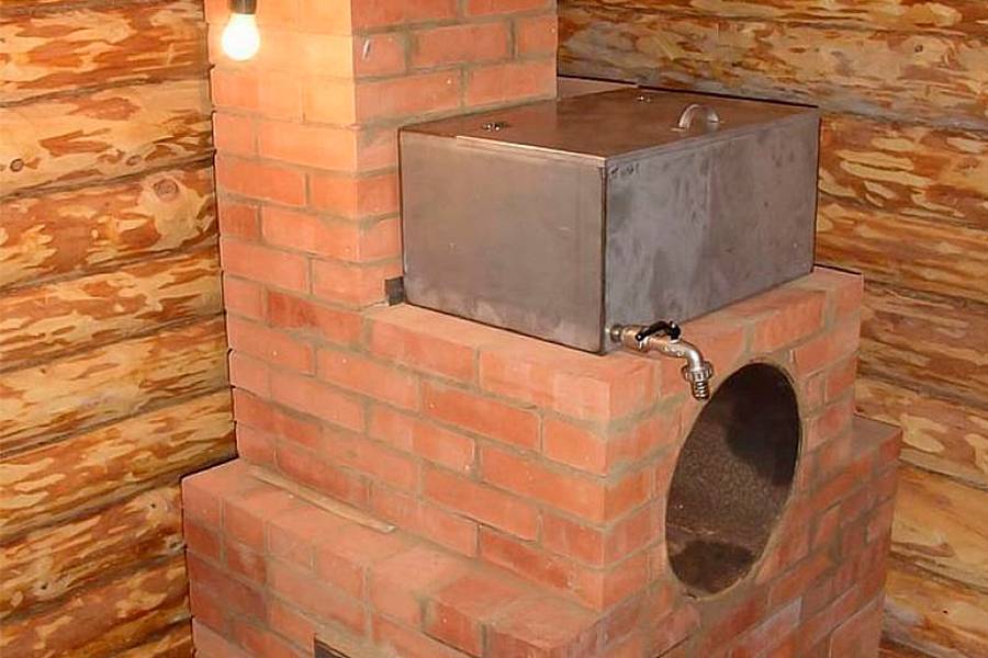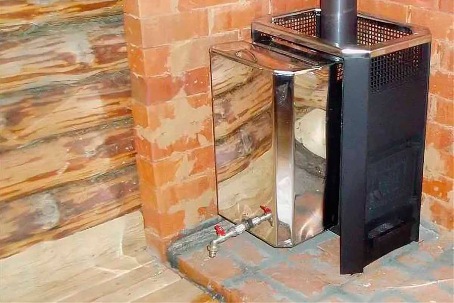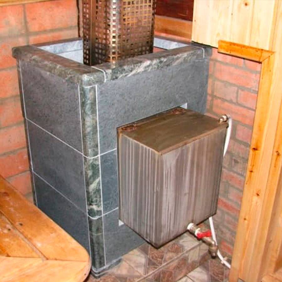 Бак для воды в баню из нержавейки вмонтирован в каменную печь
