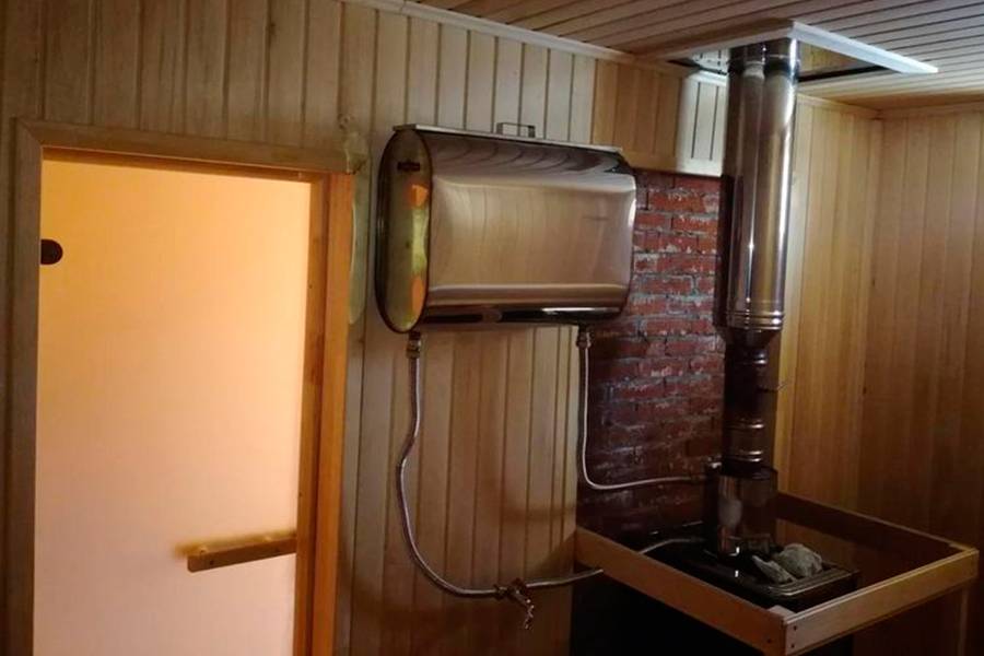 Для сауны неприемлемо нахождение ёмкости с водой в парилке, так как её отличие заключается в наличие высокой температуры и маленькой влажности. Поэтому, если вы планируете обустройство именно сауны, а не бани, то следует вывести бак на пару метров за пределы парильной комнаты.