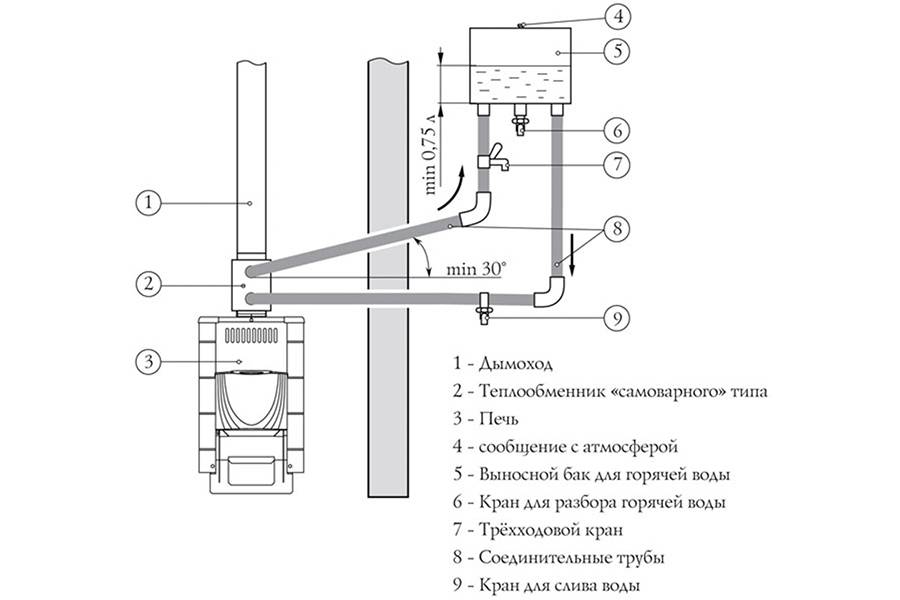 Печь и бак соединяются друг с другом металлическими трубами, по одной из которых холодная вода поступает в топку с теплообменником и, нагреваясь там до нужной температуры, возвращается по другому контуру обратно в емкость.