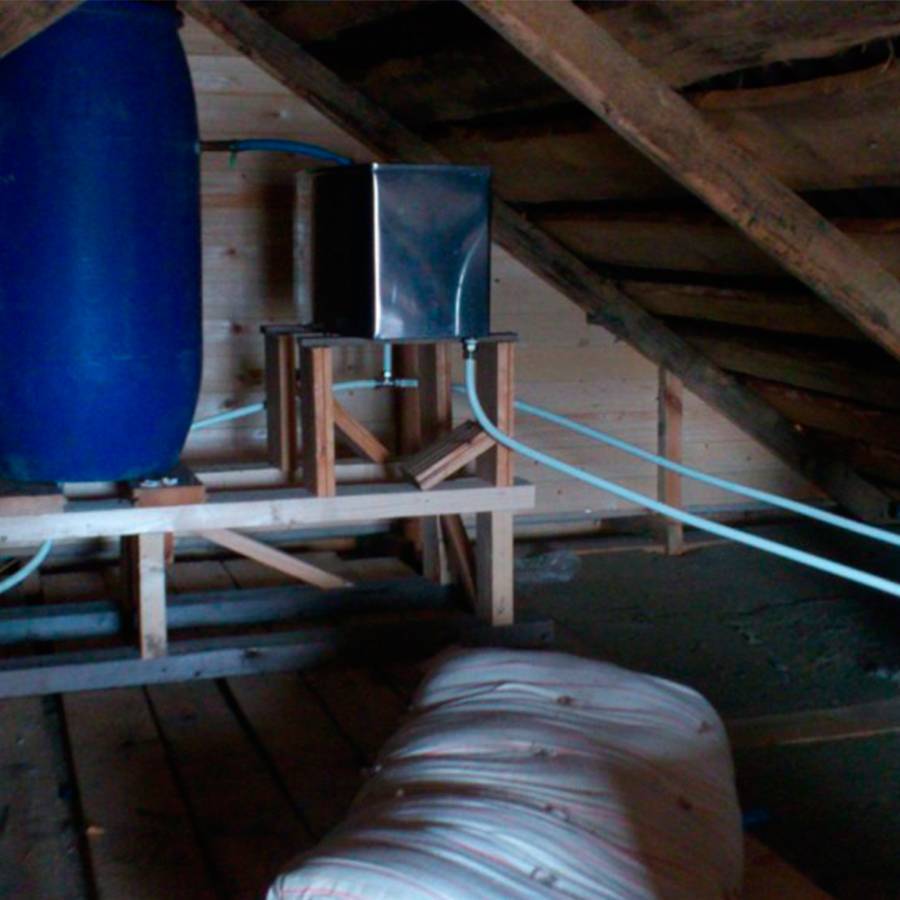 При таком варианте установки бак закрепляют на устойчивой площадке, прикрепленной к стене или отдельной. Верхнее расположение проще нижнего, поскольку не требует подводки труб от центрального водопровода и монтажа дополнительных устройств. Резервуар монтируют на максимальной высоте от места подачи: леек и кранов. Это может быть кровля, специальная эстакада и место внутри бани.