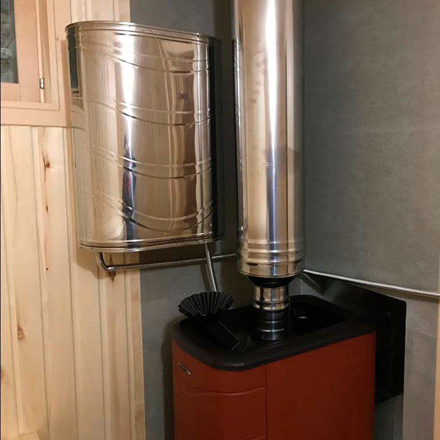 Данный вид баков носит еще название – самоварные, по сходству внешнего вида и способа крепления с этим устройством. Резервуар размещают на определенном участке либо по всей протяженности дымохода так, чтобы труба находилась в центре резервуара.