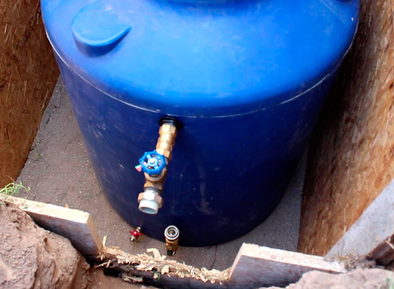 Такие баки устанавливают в подвалах. В них уже встроена система подачи воды. В этой схеме его устанавливают на уровне фундамента. Бак зарывают в грунт, а забор воды осуществляется путем установки дополнительного насоса.