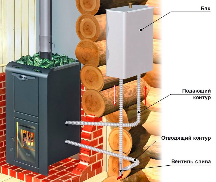 Печь и бак соединяются друг с другом металлическими трубами, по одной из которых холодная вода поступает в топку с теплообменником и, нагреваясь там до нужной температуры, возвращается по другому контуру обратно в емкость.