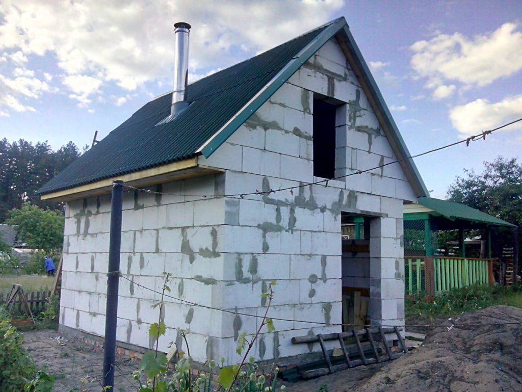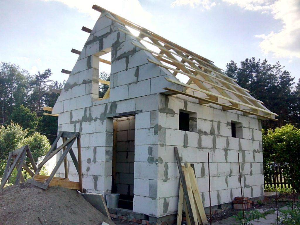 Кровлю тоже следует выбирать тщательно. Верхняя часть коробки должна быть укреплена. Это необходимо, чтобы под давлением кровельной конструкции верхние блоки не раскрошились. За счет армирования повышается несущая способность стен. Для такой задачи следует монтировать металлическую проволоку и штыри. Мауэрлатный брус монтируется на штыри. Кровельная конструкция выбирается самой простой. Это обусловлено тем, что блоки обладают не такой несущей способностью, чтобы устанавливать крышу сложной конструкции.