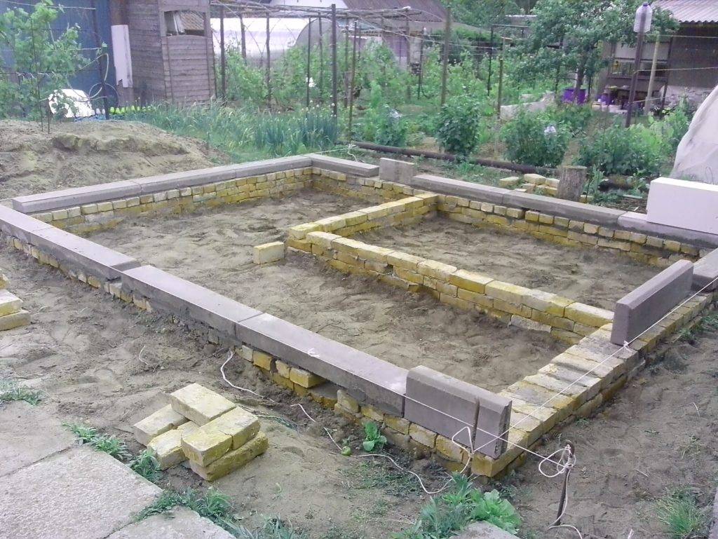 Верхний ряд фундамента выровнял бордюрными камнями. С первым этапом реально справиться самостоятельно.
