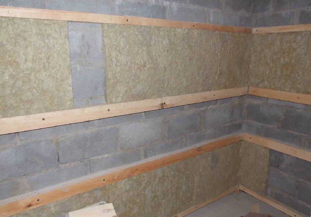 - К стене необходимо прибить деревянную обрешетку, между которой нужно уложить утеплитель, можно использовать минеральную воду.