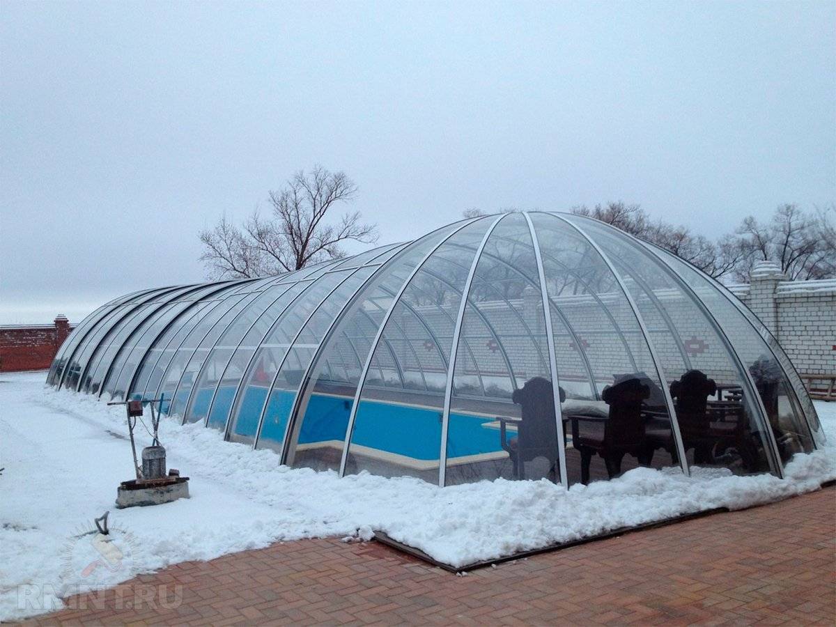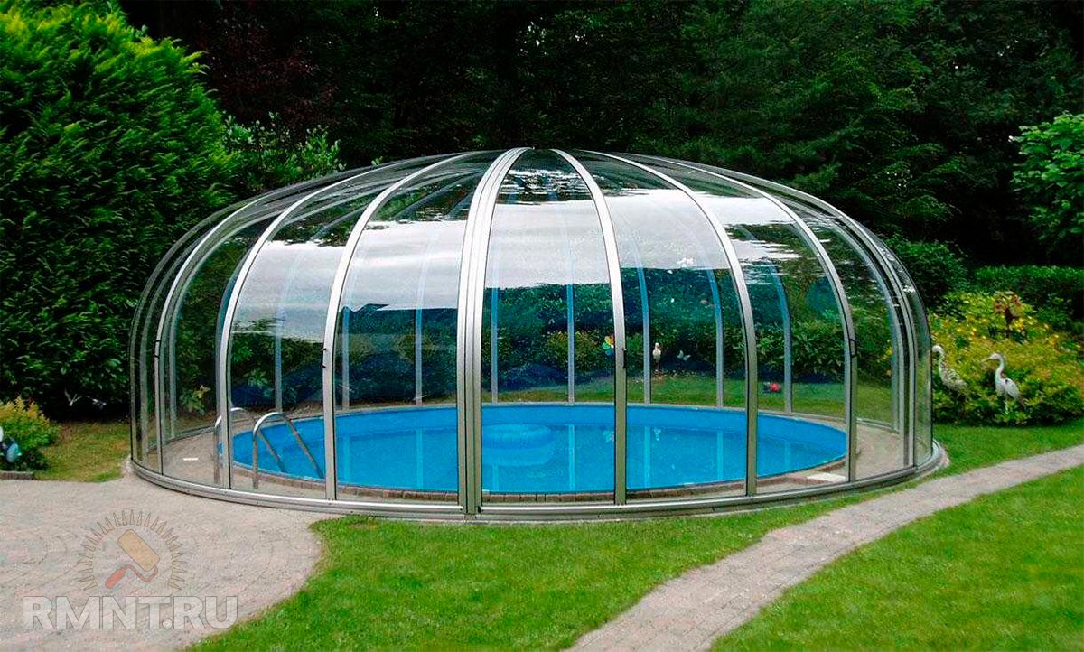Более удобными и практичными являются закрытые павильоны, представленные как в виде традиционных теплиц, так и выполненные по индивидуальному дизайнерскому проекту. К таким конструкциям относятся куполовидные павильоны, устанавливаемые над круглыми бассейнами. Плюсом конструкций является их необычный внешний вид, благодаря которому сооружение может стать центральным элементом ландшафтного дизайна. К минусам относят сложности в возведении, которые заключаются в необходимости резки листового материала на сегменты.