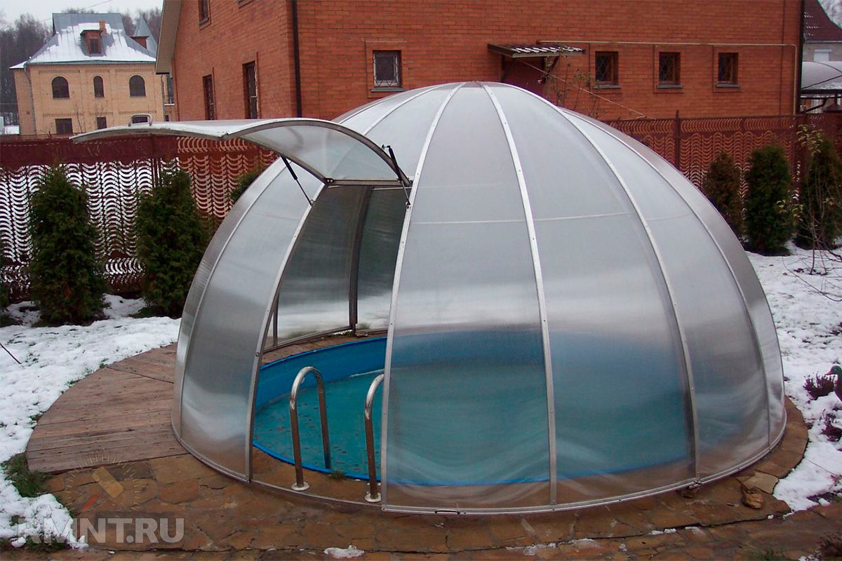 - Для бассейнов круглой формы очень часто используют куполообразную конструкцию. Стильное и интересное сооружение украсит любой приусадебный участок. Отличительная особенность данной конструкции состоит в сложном монтаже.