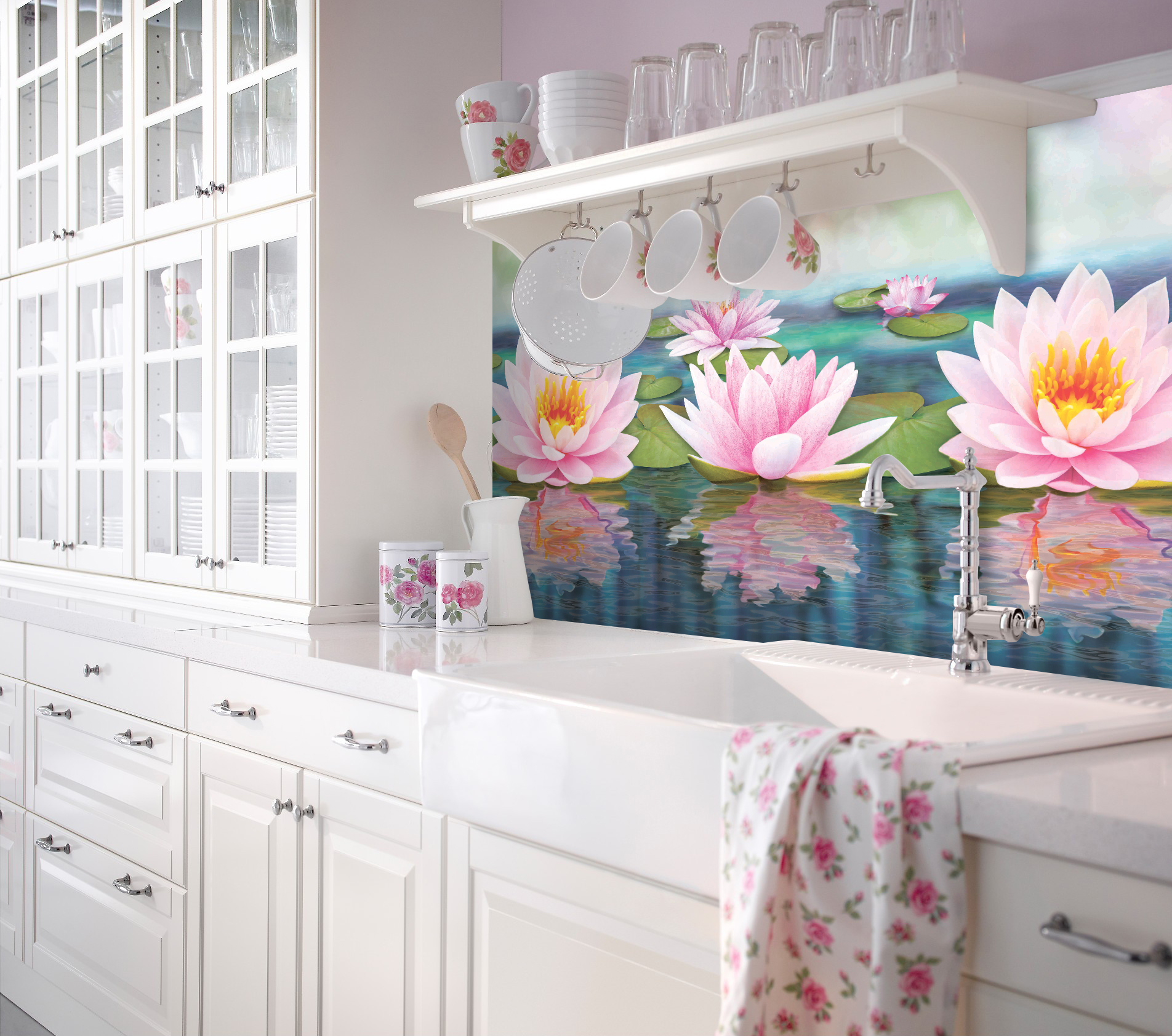 - ширина фартука должна обязательно перекрывать рабочие зоны у плиты и мойки. Красиво смотрится, когда защита покрывает всю линию гарнитура;