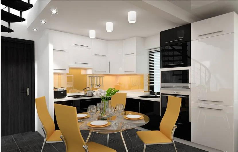 Здесь важно сохранить гармонию, особенно в случае, если фасады глянцевые. Отделка может быть насыщенной, но не яркой