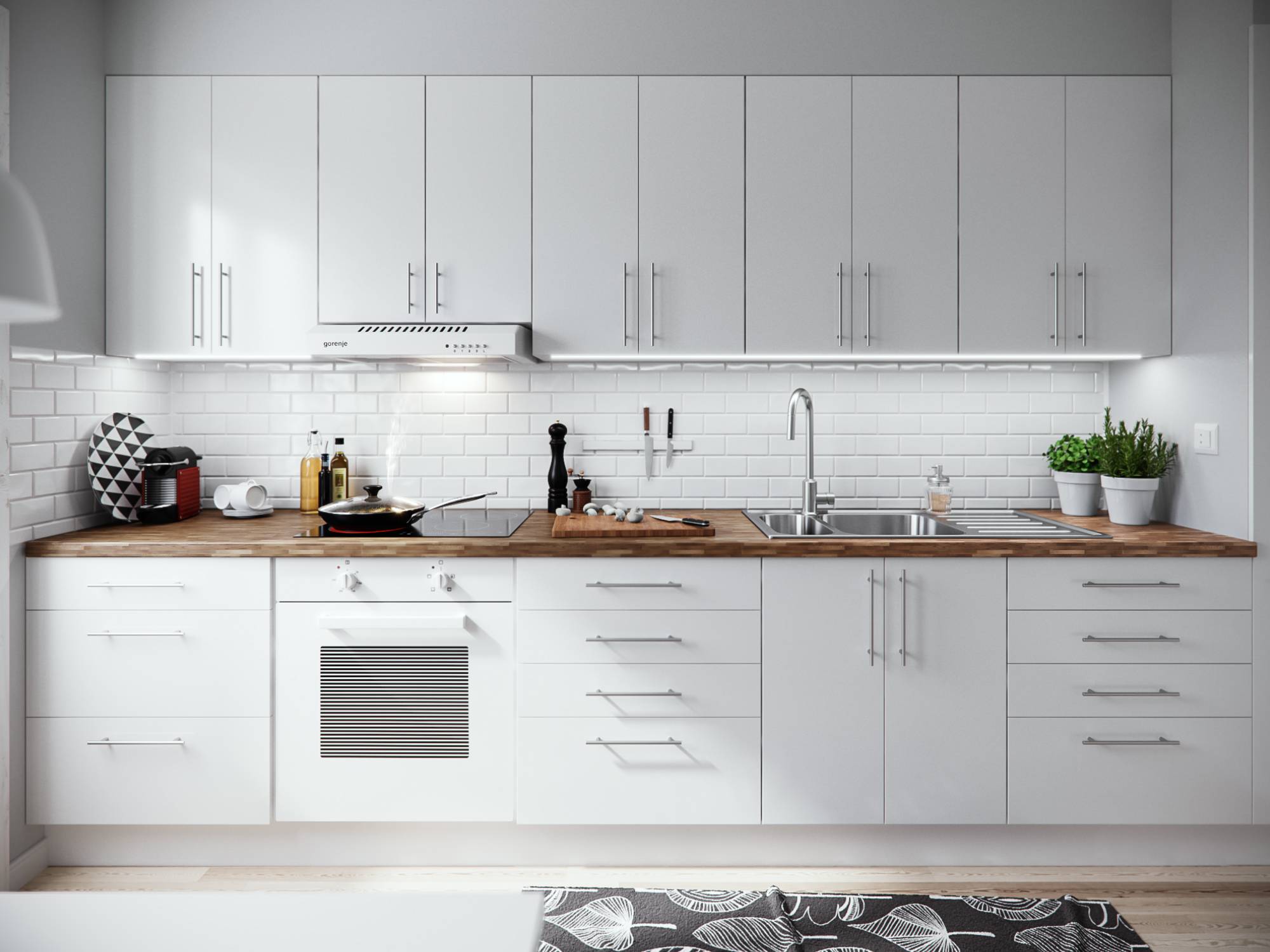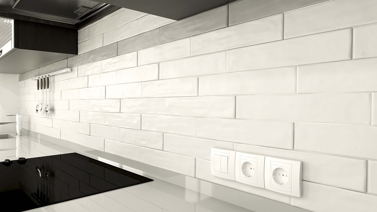 При создании белой кухни в скандинавском стиле особой популярностью пользуется белая плитка “кабанчик”