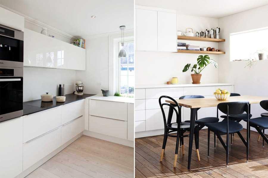 При выборе мебели и техники для белой кухни с белой столешницей есть два традиционных варианта. Либо делать монохромный интерьер и дальше использовать белые и максимально светлые оттенки. Или же сыграть на контрастах – с черным, темно-коричневым, серым или яркими цветами.