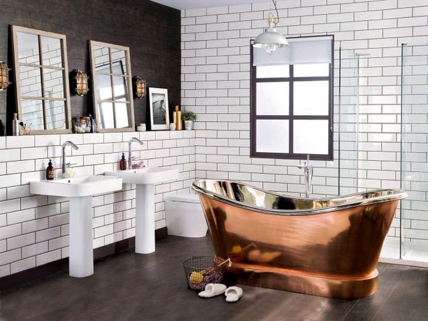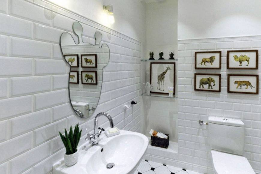 Ванная с белыми кирпичными вставками