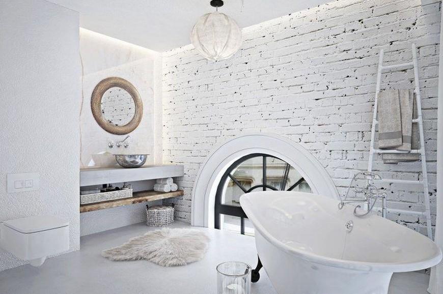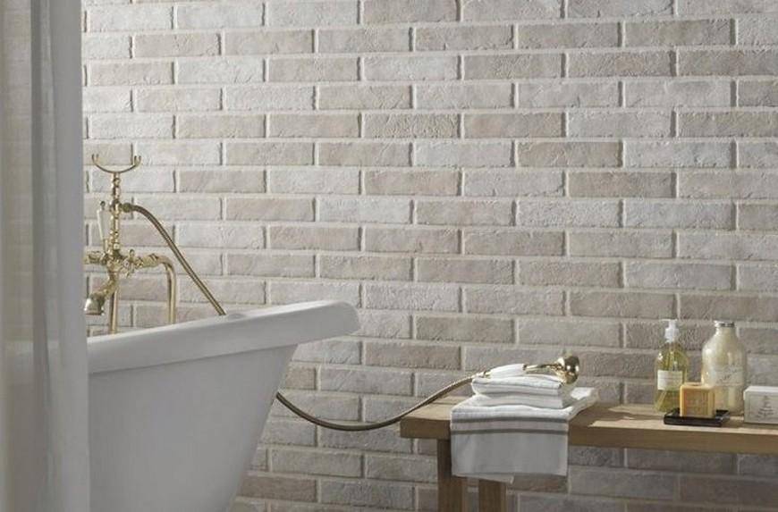 Белая кирпичная стена в ванной комнате