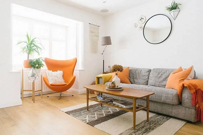 Белая гостиная с оранжевой мебельюИсточник Pinterest