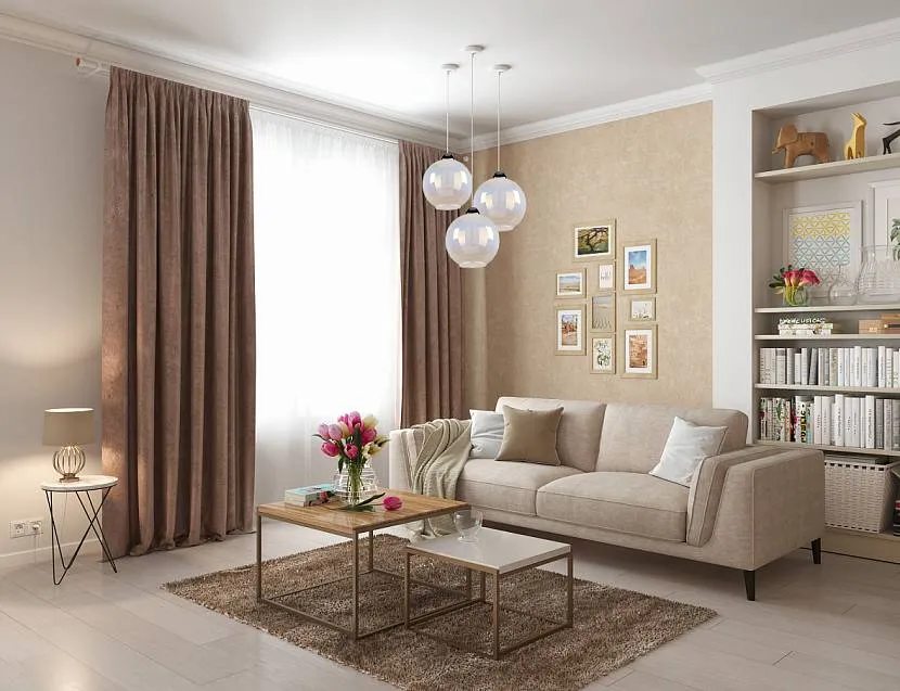 Современный интерьер гостиной в двухкомнатной квартире 80 кв. м на ул. Полянка отличается приглушенной бежевой цветовой гаммой, а также предметами мебели с нотками неоклассического стиля. Благородная патина и изящные изгибы мебели придают обстановке аристократическую изысканность.