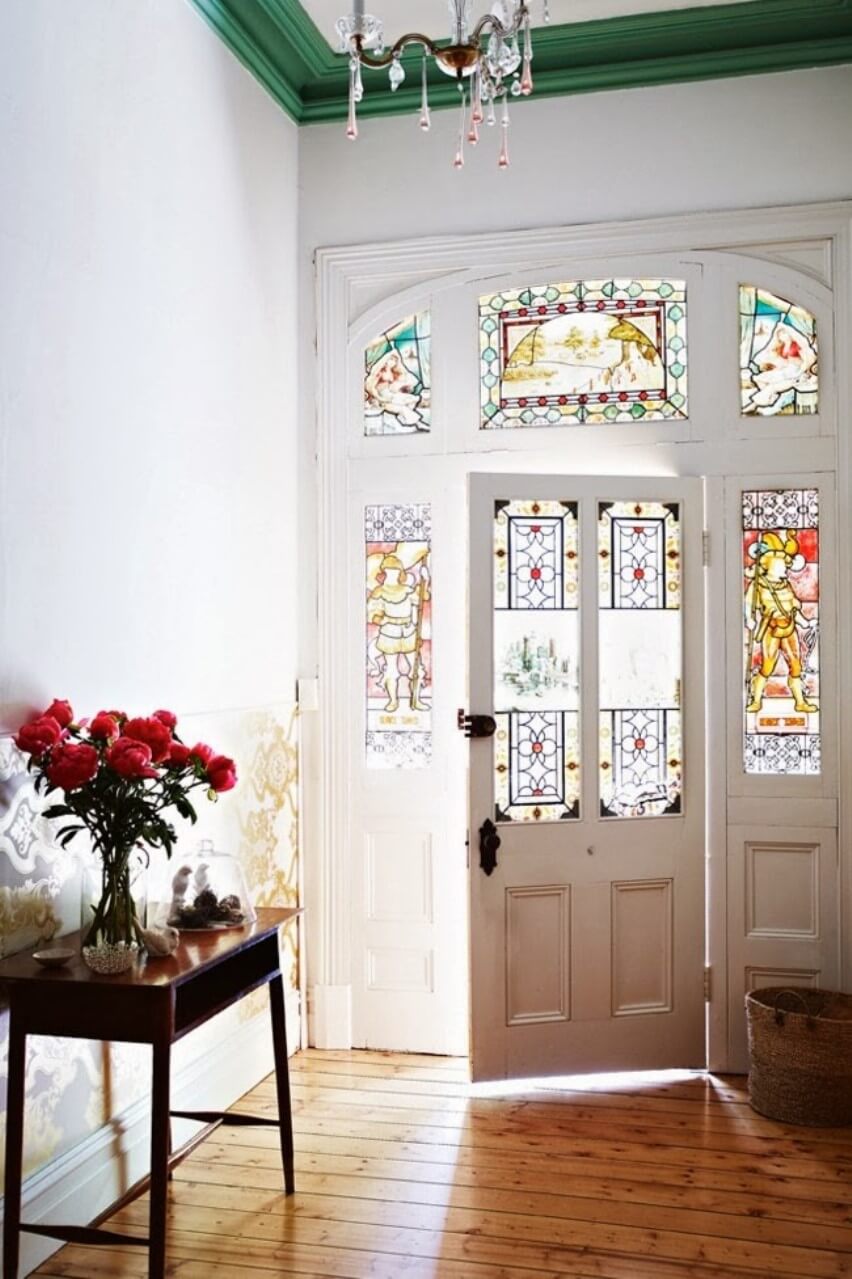 - Установка стеклянной части. Этот вариант уместен для кухонной и гостевой зоны. Обычно используют витражные или декоративные стекла, которые устанавливают горизонтально или вертикально.