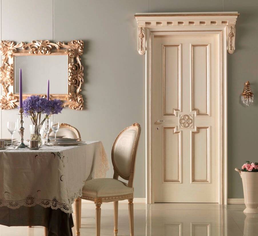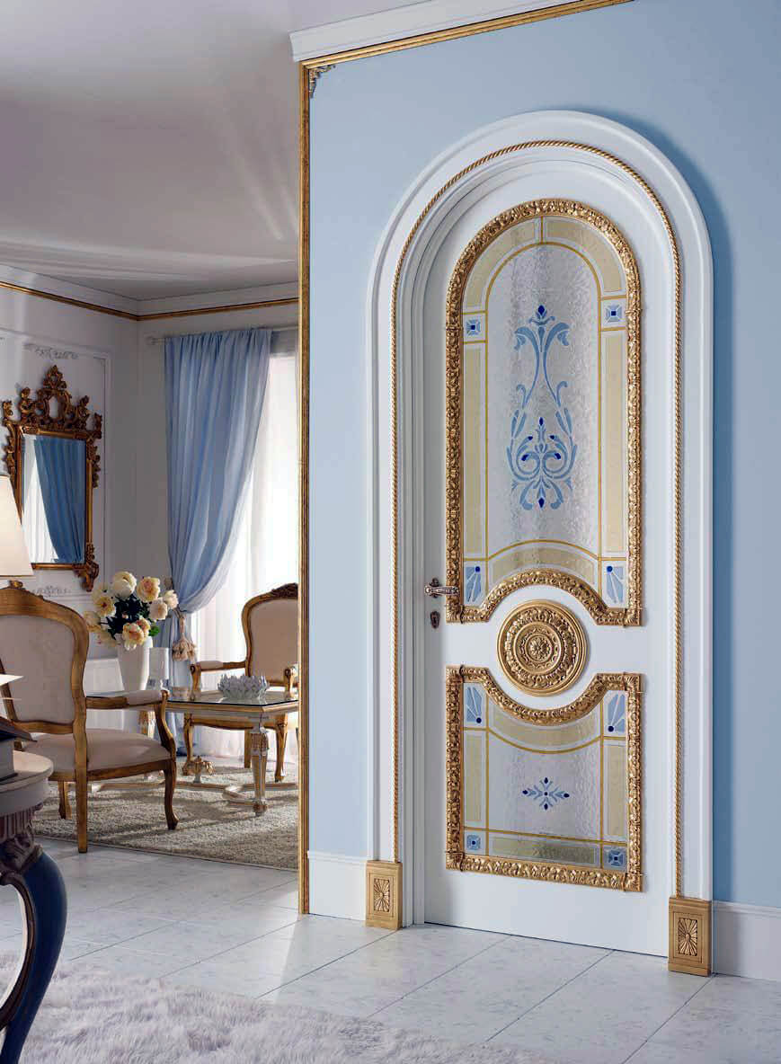 Традиции сохранились до сих пор. Что касается отличительных черт дверей в классическом стиле, то они обязательно должны быть филенчатыми, также может присутствовать резьба, патина и золочение, декоративные арочные элементы.
