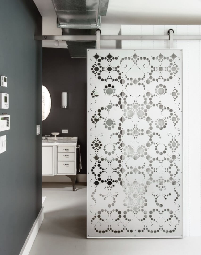 Самый простой вариант – это обычное крашеное либо облицованное ламинатом или МДФ дверное полотно. Это достаточно распространенный вариант, поскольку эти двери довольно дешевы. Их используют не только в жилых помещениях, но и в офисах. Они могут быть в виде сплошного глухого полотна или иметь вставки из матового или обычного стекла. В них могут присутствовать плавные линии и изгибы, что удачно впишется в классический интерьер, или, наоборот, лаконичность и угловатость, что позволит использовать их в стиле хай-тек или лофт.