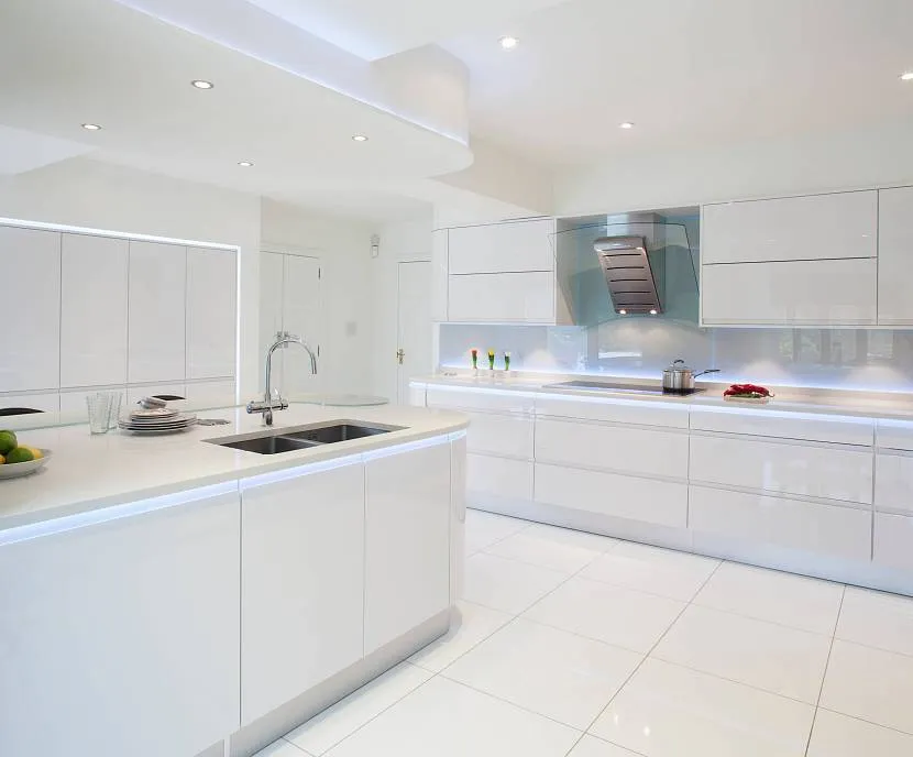 Глянцевый белый дизайн выглядит еще более сияющим благодаря хорошему освещению узкой кухни. Лучше выбрать ректифицированную напольную плитку для создания бесшовного полотна. Ее подбирают в тон стен, кухонной мебели и аксессуаров. Интерьер делают максимально простым и свободным от деталей. Минимализм в отделке и обстановке сделает кухню стильной и уютной.