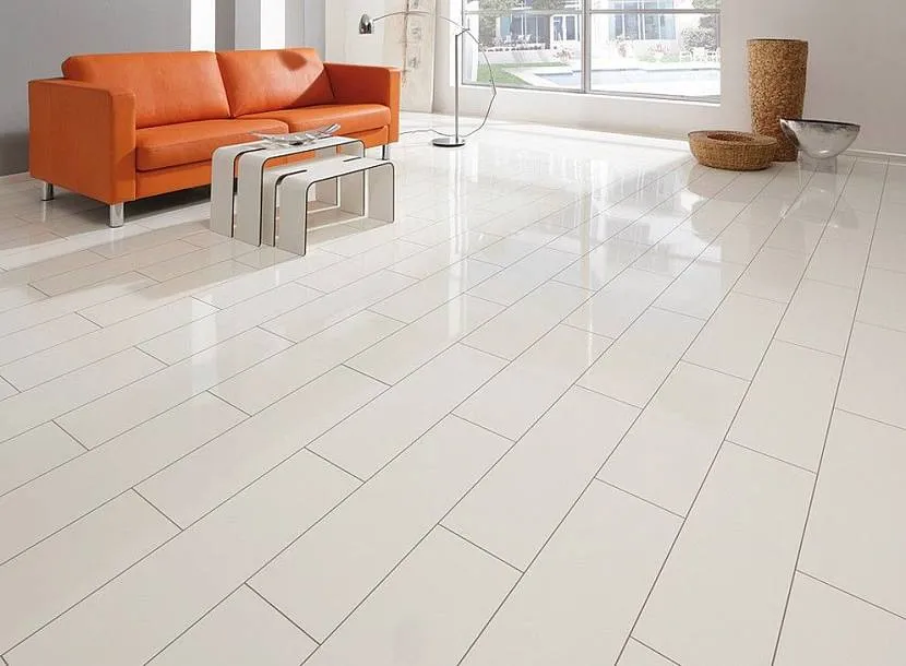 Белый пол в интерьере гостиной может заслуженно стать главным её украшением. Он будет гармонировать с белыми кожаными диванами и креслами, хромированными ножками мебели, контрастными шторами и стенами. Сюда отлично подойдёт плитка на пол белая с чёрными вставками, ламинат или полиуретановая эмаль.